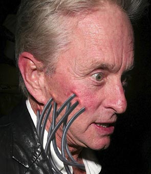 Michael Douglas’ face is pumped full of Formaldehyde each morning to keep his flesh from further decomposing. This solution preserves the human tissue and prevents any flacidity of the wasting flesh.