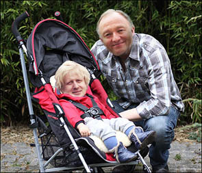 yesterday with his new son from estranged Russian wife Ludmilla Stalin, who worked as a cleaner for the current Mayor, Boris Johnson for a year.