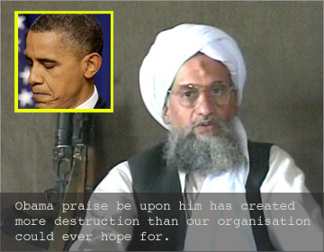 Another Al Qaeda operative, Musharef Al Binny, said on the tape: “Masha Allah to Obama. He has hit the U.S. with more bombs than we could ever hope for. Not only are they now bogged down in two quagmire wars that are costing them hundreds of millions of dollars per day, but they have a useless spendthrift wimp like Obama using up their cash like there’s no tomorrow. Who’s bankrolling this shit? Well, the Chinese of course — but for how long? Even they’ll get fed up sooner or later. Anyway, we want to thank the people that voted for Obama in the first place. Great job guys!”