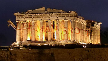 “We couldn’t get any money from the ATM, and a fight broke out between pensioners, so we thought we’d stroll by the Acropolis to wile away the time. What we saw was a ghost of the Lehman Brothers logo hanging over the facade, it was sunset, and many could clearly see a sign hanging in mid air. It said Lehman Brothers on it. Wow! I wonder what it all means?” Angela Kudunski, visiting with her family from Philadelphia, USA, told reporters.