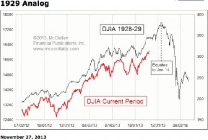 “Of course none of the printed money filtered down to any of the ordinary people. The false economic rise is an illusion created for the masses. The world is technically still in recession and never got out of it. The only people who made any money are the banking institutions. When they taper the QE, it’s going to be like 1929 x 1000. Take a gander at the Dow chart today and overlay it over the Great Crash of 1929 chart and you will see a remarkable similarity, so my advice is start dumping now folks. This artificially created rally could never last,” Bill Steinwick, an analyst at Merrill Lynch told the Financial Times.