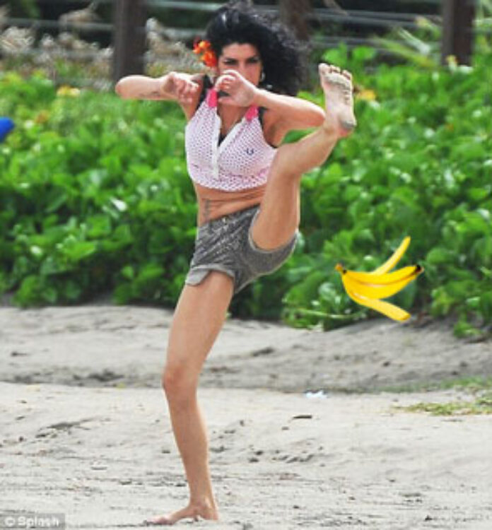 Dressed in hot pants and a cropped top, she was spotted walking on the beach before slipping on a discarded banana peel.