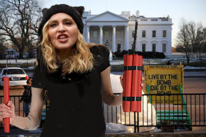 Agent 9, Secret Service, revealed the full story to waiting news reporters: “We saw Madonna walking up and down the street. I signalled to my fellow agents and spoke in my earpiece, you know like we do all the time. She saw me, then tried to act normal even though she had three sticks of dynamite in her hand. I caught up with her and told her in no uncertain terms to take that dynamite and get the hell away from the White House. Madonna, looked me up and down, grabbed her crotch, then skipped away singing ‘La Isla Bonita’. Thanks to the secret service another tragedy was averted. We deserve a medal or something for our bravery.”