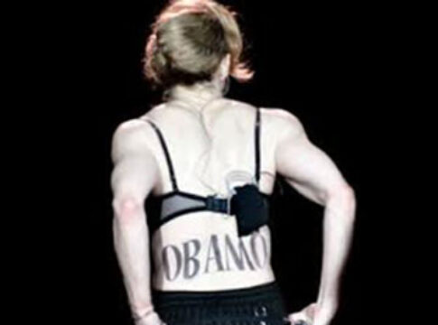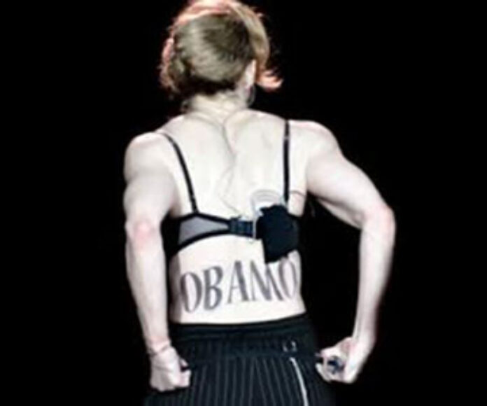 Unfortunately for the self-proclaimed Queen of Pop there was a major malfunction by her assistant backstage because the word OBAMO was painted on her back instead of OBAMA.