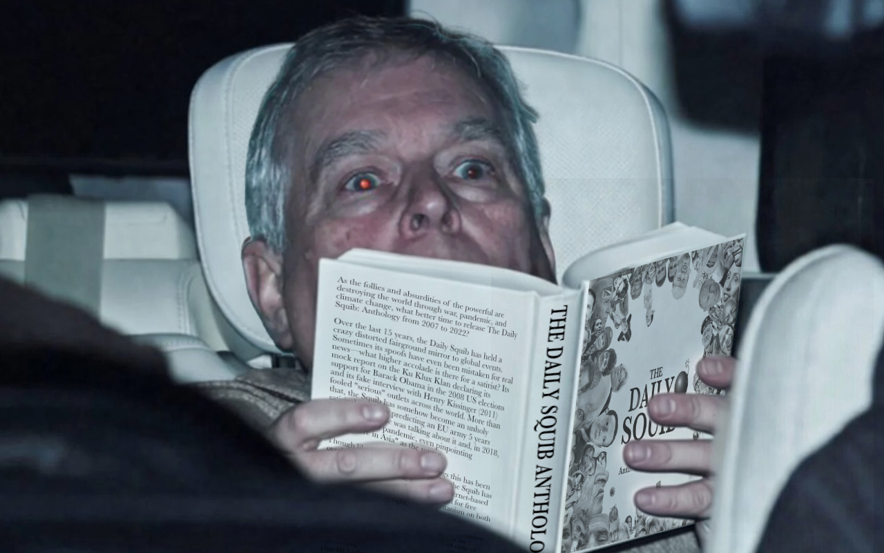 The former royal prince Andrew was pictured yesterday sweating profusely in the back of a chauffeured car with a look of abject horror and disbelief as he held up a copy of the Daily Squib Anthology.