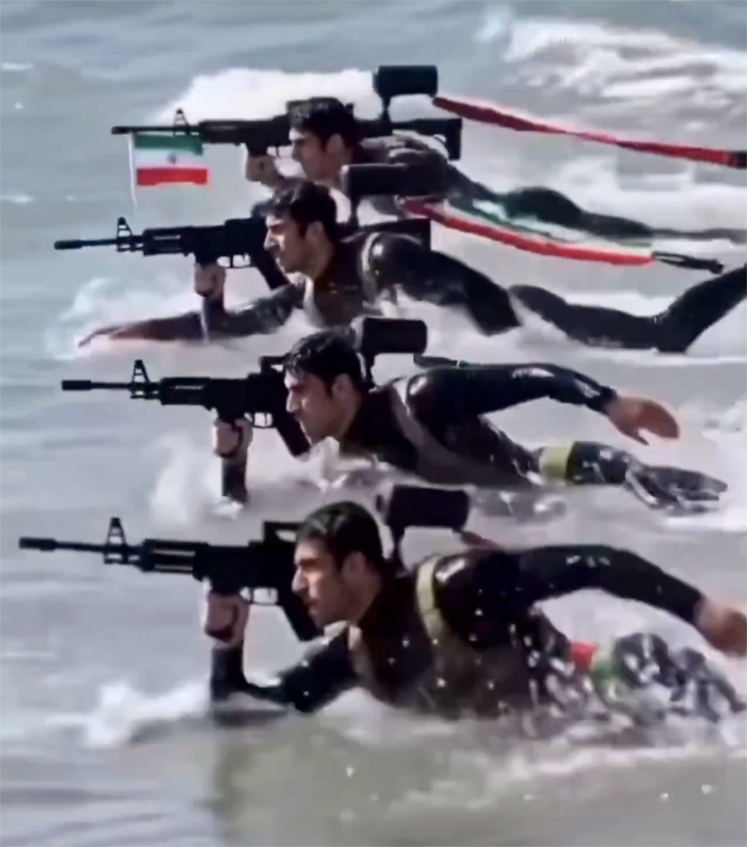 Some of the videos are hilarious, like, for example, the video below where one presumes the last remnants of the Iranian Navy showcase their amazing skills with three arms per Iranian special forces soldier skipping through the waves towards the American warships.