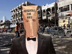 “I’m gonna go into the Sunni triangle wearing a paper bag on my head with the words ‘Shia For Hire!’ and if that don’t do it nothing will. Gee, I’m so bored already no coke in this town and the chicks wear black cloths all over their heads.”