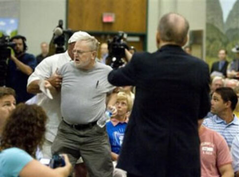 Here in Lebanon Pennsylvania jeers and taunts ring out from the local town hall where a congregation of locals rail at the new president’s plans to socialise American healthcare. The majority of the assembled crowd are white middle-class and damn angry.