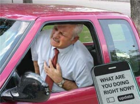 “I was just crossing the fuckin’ river when I felt this motherfuckin’ huge pain in my chest. I immediately got my iphone out and got onto twitter for an update. I even took a photo of my face as I crumpled up on the floor of my fuckin’ car. It didn’t matter that I was travelling at sixty fuckin’ miles an hour. I got the tweet update in and that’s all I cared about. Even when I ran over that poor bastard in a wheel chair, it still didn’t matter. I couldn’t breathe either, and my vision went blurry, I was still goddamn tweeting,” he said from his hospital bed.