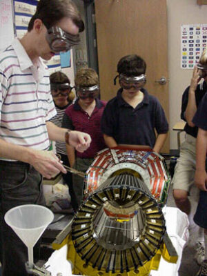“I had the idea after watching eighties movie, Weird Science, as well as the current CERN Hadron Collider live web stream footage. I incorporated the synchotron from bicycle parts found in my dad’s shed. The high energy particle accelerator already collides protons at over 12 teraelectronvolts, which is a phenomenal amount of energy and supersedes anything that CERN has achieved so far. What the adults at CERN neglected to understand is that, small is big when it comes to supersymmetry, and as you can see, I have replicated their particle collider on a miniature scale that is much more efficient and powerful.”