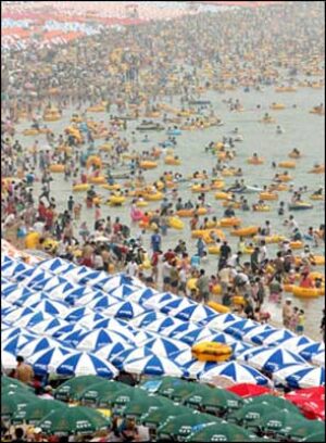 Party officials were thrown for a six when panic suddenly erupted and 50,000 Chinese swimmers in sector G decided to run out of the water whilst screaming in extreme alarm. This resulted in 20,000 sector H sunbathers being inundated by panic as well.
