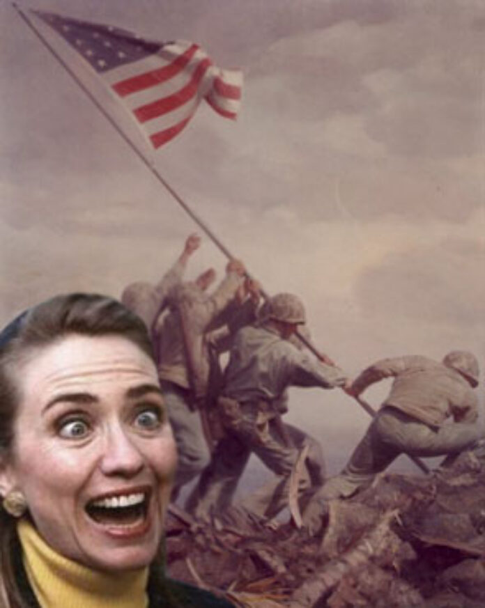 Hillary Clinton then goes on to describe the hard battle to reach the summit of Mt. Obama, “It took us four days of solid fighting, there were bodies everywhere and the mountain itself was slippery with the blood and guts of good men who died fighting. On the fourth day only a few of us survived and we were exhausted. This is when we raised the flag and a photographer took the famous flag picture.”