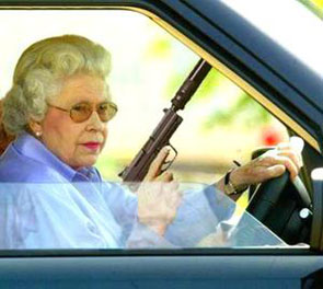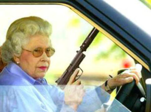Hello magazine recently published a story on the Queen’s hitwoman antics with a full page spread of her and her gun.