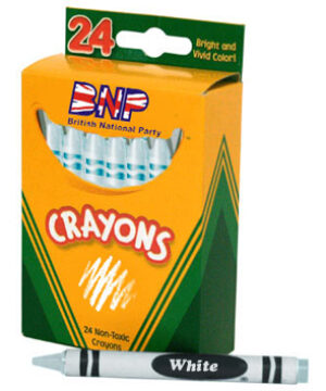 “We’re introducing the new BNP crayons to schools in Britain. Instead of a set of colours there will only be one colour allowed in the new BNP packs. Yes, you’ve guessed it — white will be the only colour allowed.”