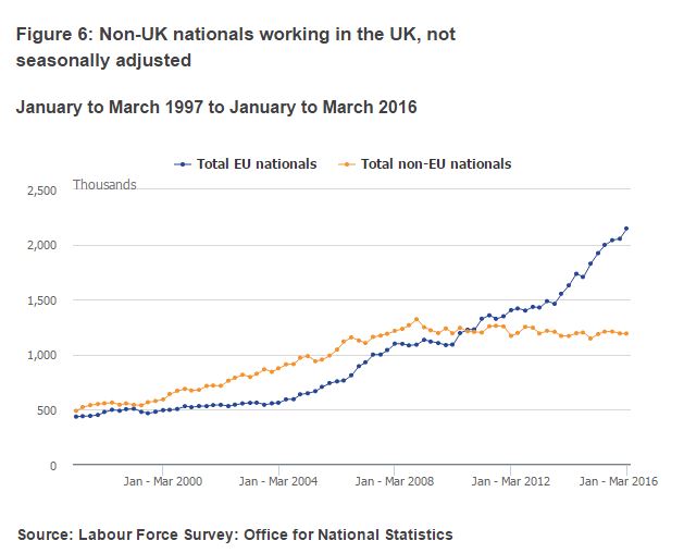 The ONS states that ‘Looking at changes in non-UK nationals working in the UK between January to March 1997 (when comparable records began) and January to March 2016: the number of non-UK nationals working in the UK increased from 928,000 to 3.34 million… the proportion of all people working in the UK accounted for by non-UK nationals increased from 3.5% to 10.6%… this increase in non-UK nationals working in the UK reflects the admission of several new member states to the European Union (EU)’.