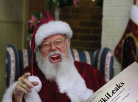 “It’s that Assange guy again. He’s leaked the all important Christmas present list on the internet. Now every child in the world knows what they’re going to get. What an arsehole,” Santa said, before booting one of his little helpers out into the snow.