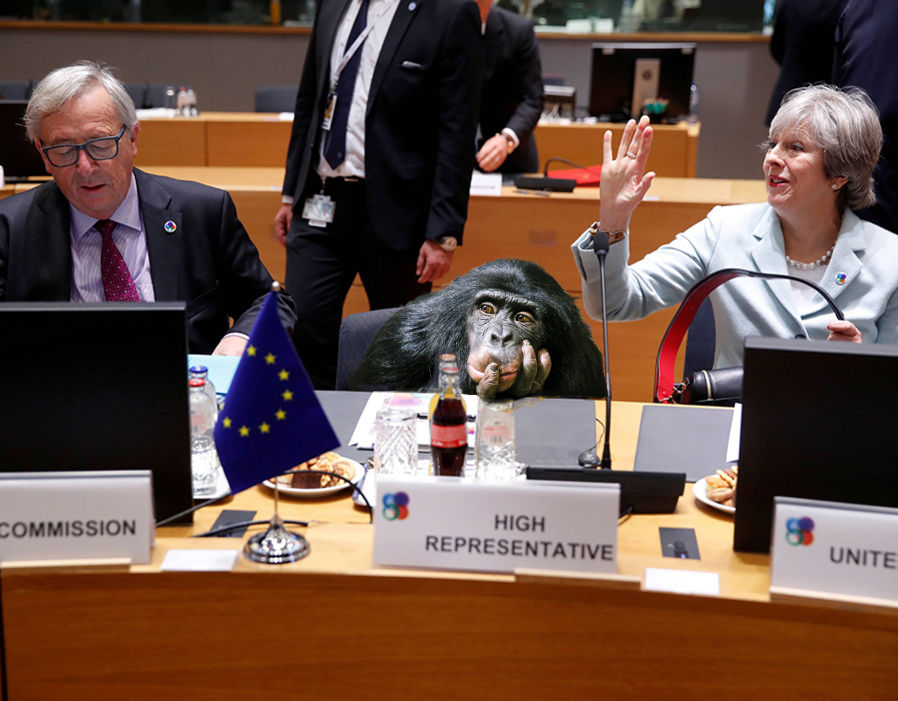 Mrs May, the British PM in charge of Brexit talks asked Bimbo the chimp whether upping the Brexit ransom to £40 Billion would allow talks to go ahead regarding trade deals?