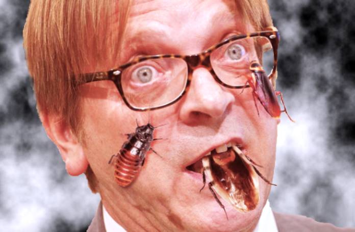 “Monsieur Guy Verhofstadt was fuming at the British, calling them swine, this name and that name. From out of nowhere, some cockroaches, these were well seasoned ones – quite large – came up from under his desk and onto his quivering face. Some went onto his glasses, others burrowed into his ears, and from my count, he ate fourteen of them, crunching with gusto their hard shells. One of them was very large, and when he crunched down on it with his teeth, the insides oozed out over his chin. Guy Verhofstadt, simply slurped up the greenish slime with his long tongue, then continued on as if nothing happened,” Jean Gilles Punaise, a senior delegate for the EU’s transport commission in Strasbourg told news media after the talk.