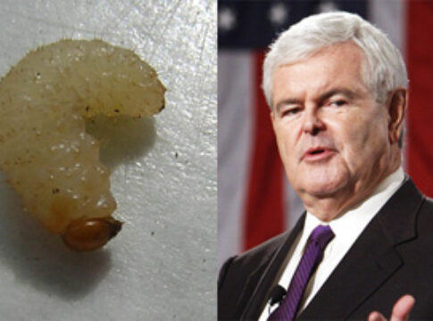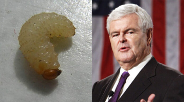 The maggot farm’s proprieter, Ed Relnick, was pleased that the Republican candidate made a stop at his farm: “They came here in the morning with their entourage. When Gingrich stepped off his tour bus, I just said, shiiet, that boy looks like one of my maggots, his whole head looks like a maggot head. I just thought it was so appropriate. Before he left, I gave him a box of my best maggots, and he said he liked the look of them maggots. He’s gonna win the Republican primaries for sure. We’re gonna have a maggot as our new president, same as the other maggots huh.”