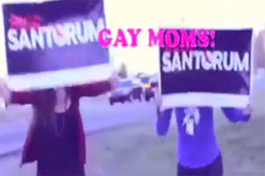“It’s a beautiful song where two gay moms praise what Santorum is doing for lesbians and we want to just show our Christian sapphic bean flicker adoration for Rick. You know, a joy buzzer love so he can win the election once he becomes the Republican candidate to take us forward into the promised land,” Gina Lunchmeat, 21, one of the singers in the duo, told Tulsa’s public access TV station, the Badly Wrapped Kebab politics show.
