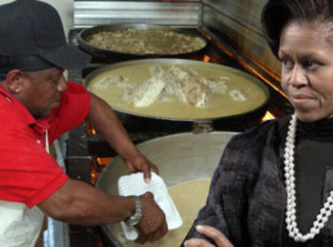 “I was cooking the Obamas they favourite meal, hogs maw, chitlins, ham hock, corn bread, cockscombs wit’ rice and beans, hmm, hmm when she came in and started shouting at me that I ain’t cookin’ it like her mama cooked it. I said ‘bitch cook this’ and threw a bowl of chicken feet at her. I never seen eyes like that, I gots thrown out with the trash without pay, shiiet!” Edna Jackson, a cook who is now working for a downtown Washington DC restaurant recalled.