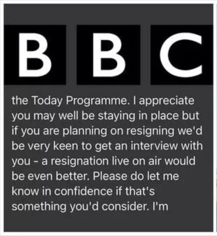 The BBC text sent to MPs: “I appreciate you may well be staying in place but if you are planning on resigning we’d be very keen to get an interview with you – a resignation live on air would be even better. Please do let me know in confidence if that’s something you’d consider.”
