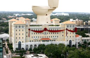 The $195million Flag Building is a massive seven-story, 477,000-square-foot complex and the tallest building in Clearwater, which is the ‘spiritual headquarters’ of the 59-year-old Scatology religion. There is even a 175 foot high fully functioning toilet bowl on the roof of the monumental building as a dedication to the holy founder of the religion of Scatology, N. Ron Hubbub who sadly died in a terrible toilet accident when some Kretins dragged him screaming down a ceremonial toilet bowl over twenty years ago.