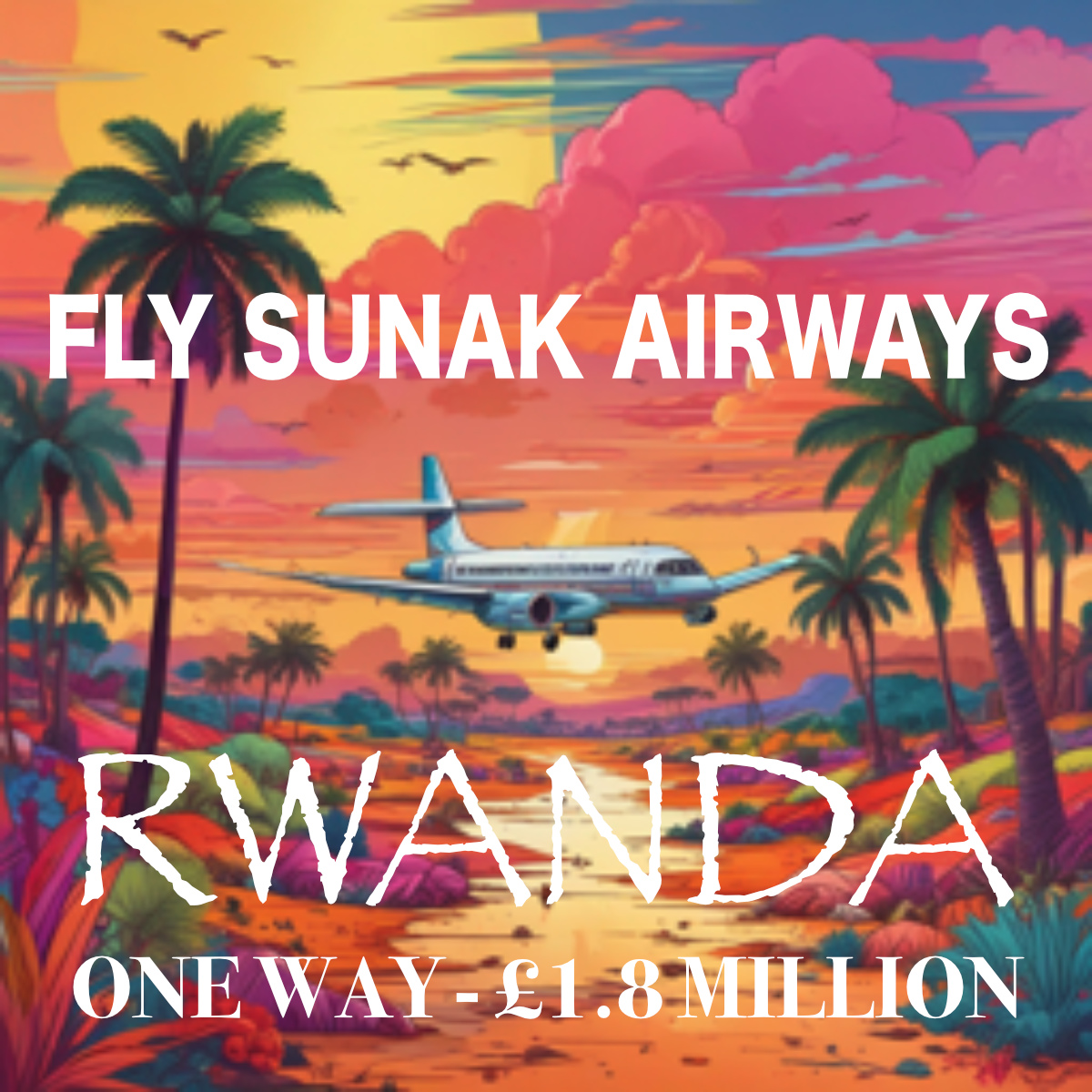 Eager for election, unelected autocrat Rishi Sunak has unveiled ‘Sunak Airways’ where illegal immigrants who crossed the Channel in rubber dinghies will be given a one-way ticket to Rwanda at a cost of £1.8 million per immigrant. Fly Sunak Airways One Way to Rwanda – is the new slogan.