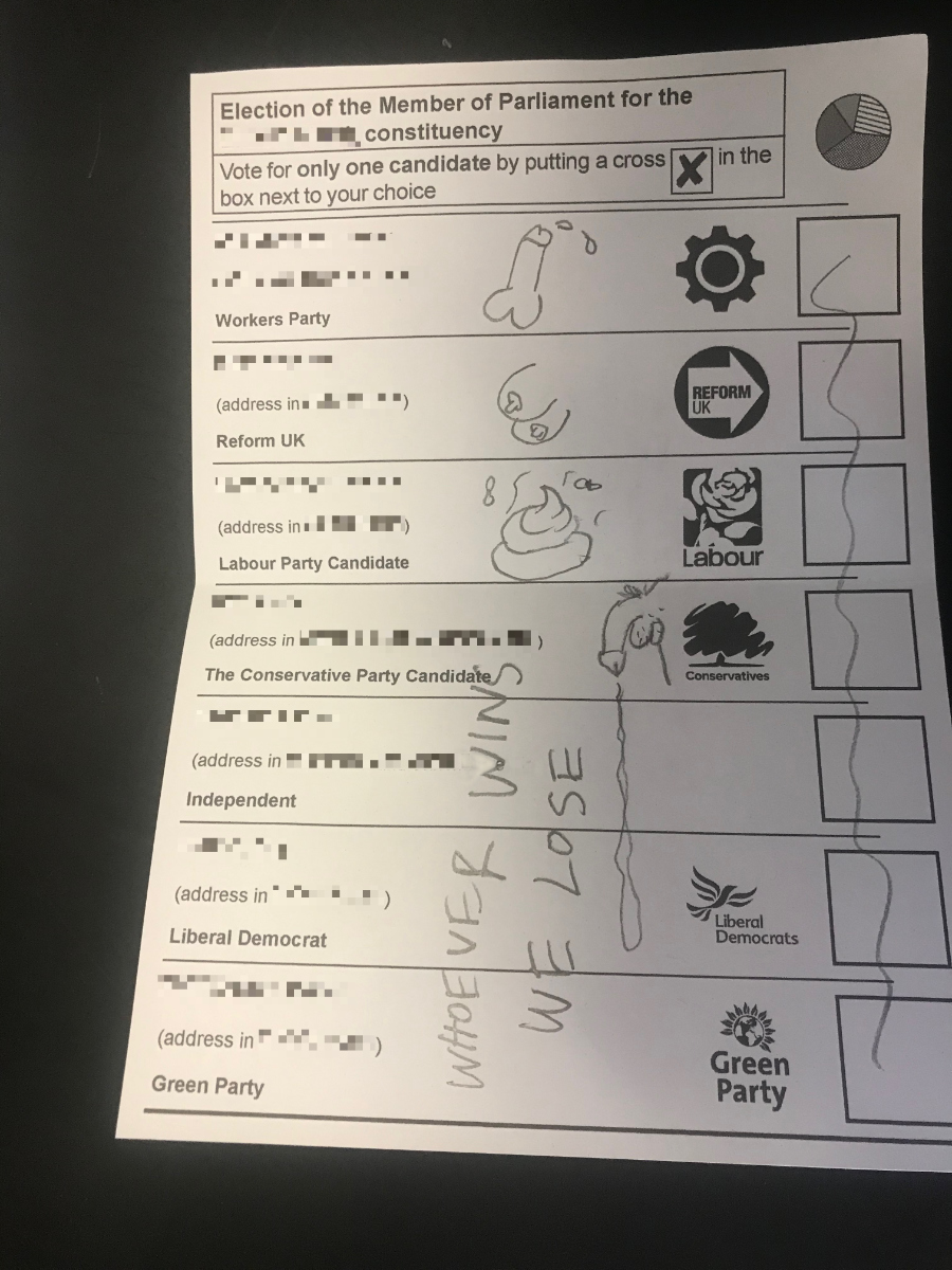 The only real vote yesterday was to spoil the ballot, and the low vote share to acquire Labour’s win exemplifies the profound disgust felt by many disenfranchised voters across the UK.