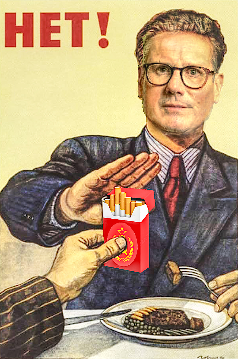 Supreme Comrade Starmer of the EU UK Soviet Labour Stasi Party has today announced a new direktive that forbids any form of smoking in public. DIREKTIVE 23912A was announced forbidding smoking in public places including pub gardens, vehicles, roads, alleyways, shops, public buildings, beaches, mountains or under the sea.