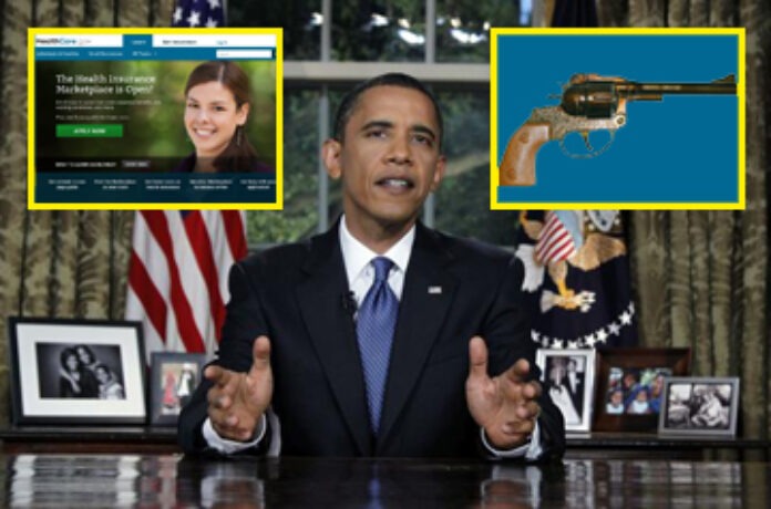 “I will repeal the failed Obamacare laws I created along with the two bit mangy website if you give up your guns. Now that’s a good deal right?” Obama said during a public address Wednesday.