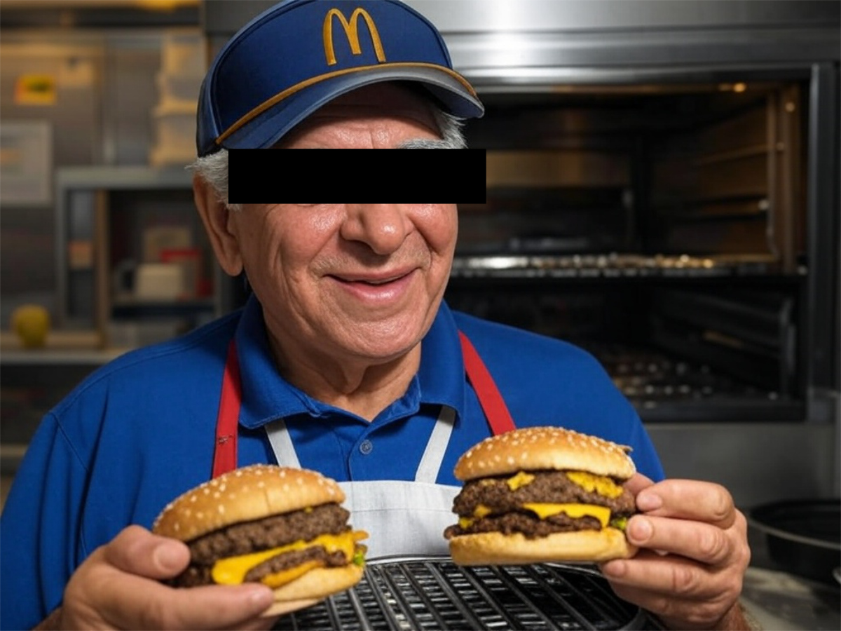 “It gets me outta the house, away from the dragon. I’m now flippin’ burgers with the young people. Thank you, Donald Slump. That tariff thing you pulled outta your hat really helped me when I lost my entire retirement money.”