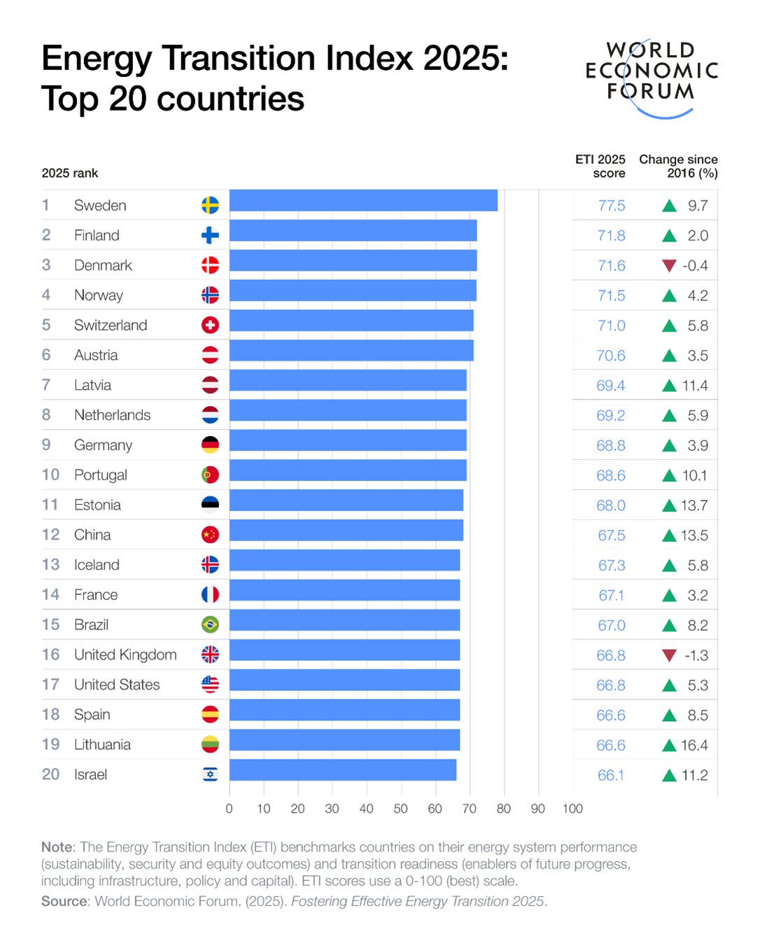 Sweden, Finland, Denmark, Norway and Switzerland topped the rankings, benefiting from long-standing policy commitments, well-developed infrastructure, and diversified low-carbon energy sources.