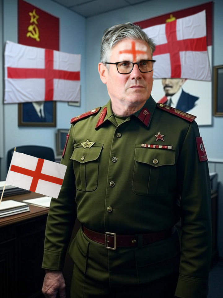 The vandals also painted a depiction of the banned flag on Comrade Starmer’s forehead while he was listening to an urgent communiqué detailing his upcoming orders from Brussels.