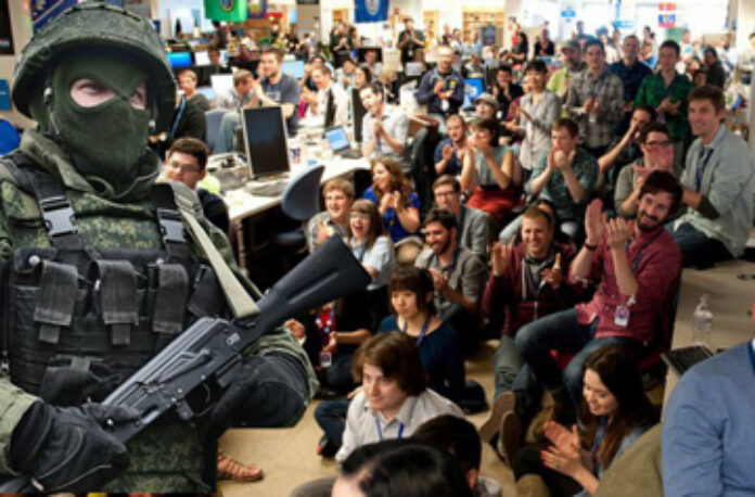 “We’re going to reason with these brutes holding guns. Put down the weapons you might shoot someone. It’s dangerous. Also you brute Russians need more styling, what is this cammo stuff you’re wearing? It’s so unfetching, I believe a nice v neck, some designer glasses and Jack Kerouac book under your arm would be more fashionable. These Russians need to open a few more pot shops in Crimea, then they could relax a little better, and don’t forget your Kool aid you Russian war people with guns, drink up and you can be just like us,” Mr Limprist, told his audience on MSNBC.